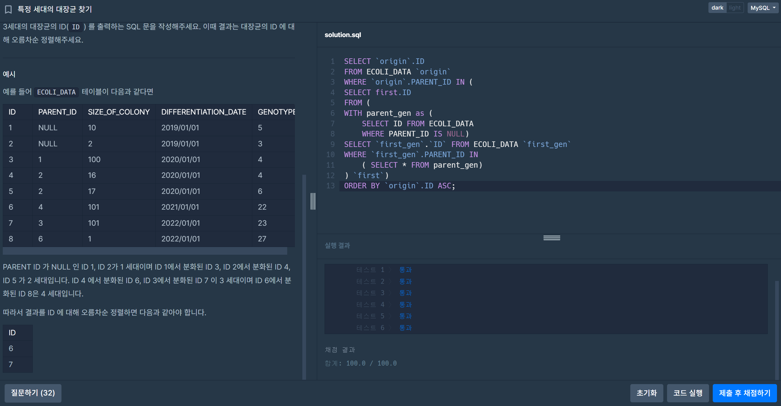 WHERE `first_gen`.PARENT_ID IN -- 부모 ID가 0세대 ID인 데이터는 1세대 데이터